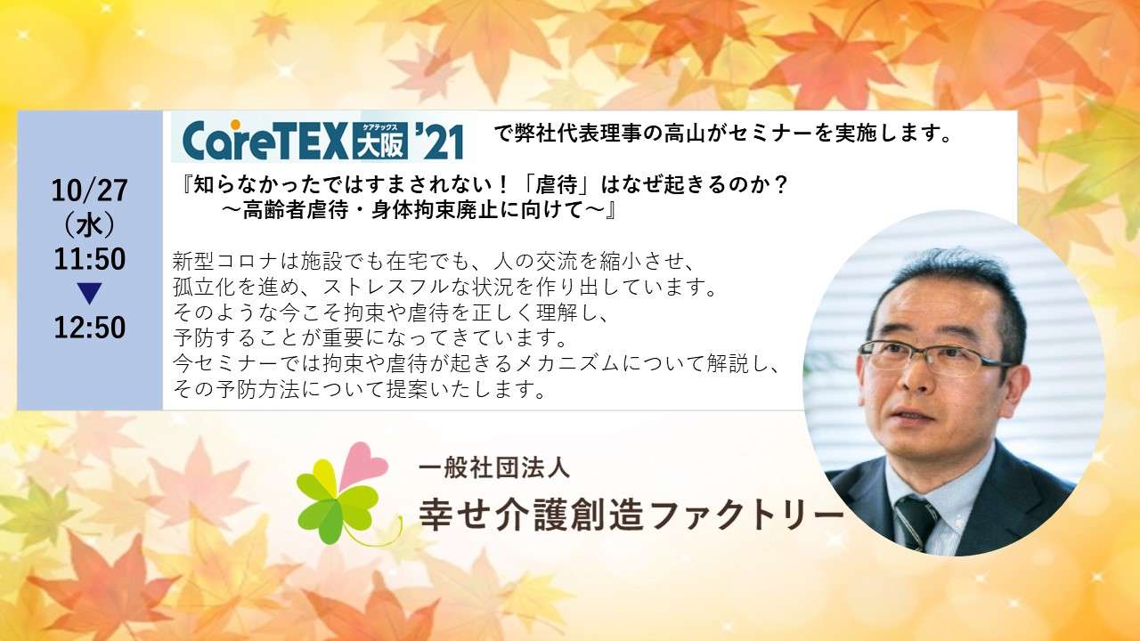 大阪府で介護研修事業を行っている一般社団法人幸せ介護創造ファクトリーでは、介護職に従事されている皆様の目線に立って、介護による負担を軽減するにはどうすれば良いかを、しっかりと考えて事業を進めております。介護による負担が軽減されることは、介護職に対してポジティブなイメージを持って働こうと考える方が増えることによって、高齢化の進んでいる日本の社会を支えることに繋がります。人と人が助け合うことによって生活を続けていく介護の現場は、本来は感謝の気持ちと笑顔の絶えない場所で、介護職一人一人が自分の仕事に誇りを持って続けることができることが重要です。