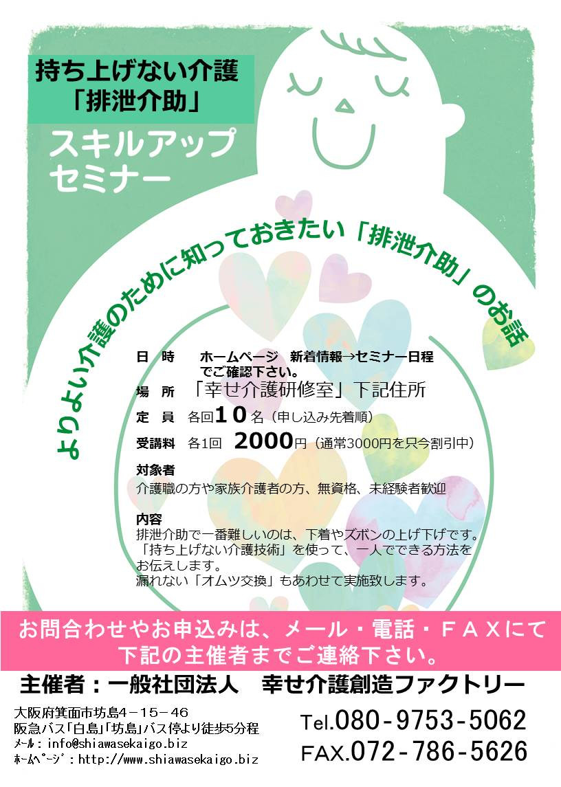 特に、家族介護者の方に一番負担の大きいのも、この介護技術・排泄介助になります。オムツ交換(付け方・コツ)を学ぶセミナー(研修)では、家族介護者の方にも分かりやすくお伝えしており、介護技術・排泄介助の負担が軽減されると、在宅で介護をすることも可能となり、最後まで自宅で過ごすが可能になります。