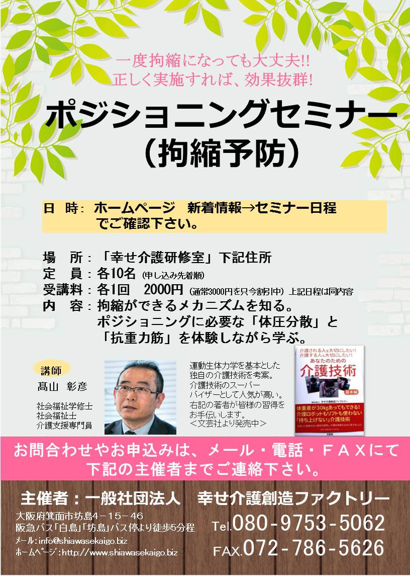 専門的なポジショニング(介護)・拘縮予防の方法を介護職やご家族様でも分かりやすく体験型のセミナーを大阪で開催しています。理学療法士や作業療法士、看護師などの専門職の方もご受講される人気のセミナーです。ポジショニング・シーティングの基本を学び、是非日々のケアにお役立て下さい。
