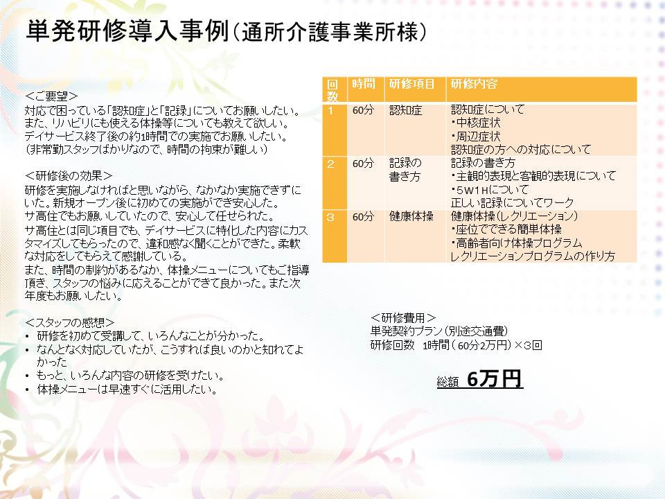 出前研修<介護>講師派遣導入事例 2019/09/16 研修導入事例~通所介護事業所様~ 出前研修<介護>講師派遣導入事例 <導入内容> 出前研修<介護>講師派遣では、対応で困っている「認知症」と「記録」についてお願いしたい。また、リハビリにも使える体操等についても教えて欲しい。非常勤スタッフばかりなので、時間の拘束が難しいため、短時間での実施をお願いした。 <スタッフの感想> なんとなく対応していたが、こうすれば良いのかと知れてよかった。 体操メニューは早速すぐに活用したい。 <研修効果> デイサービスに特化した内容にカスタマイズしてもらったので、違和感なく聞くことができた。出前研修<介護>講師派遣では、時間の制約があるなか、体操メニューについてもご指導頂き、スタッフの悩みに応えることができて良かった。 講師派遣の詳細はこちら お問い合わせはこちら 法人会員も募集中 動画で伝達研修も可能です。 講師派遣を利用したいけど、介護職員のシフト調整が大変…。 どの時間帯に実施しても受講できない職員はどうしたら良いのか悩む…。 夜勤だけの職員など特定勤務の職員は研修を受講できない…。など 介護現場ではなかなか研修を実施したくてもできないのが現状です。 そんなときに、オンライン研修が最適です。 動画(オンデマンド)研修ですので、好きな時間帯に好きな演習動画を何度も繰り返し見ることができます。 オンライン会員の詳細はこちら お問い合わせはこちら 講師派遣 研修プログラム