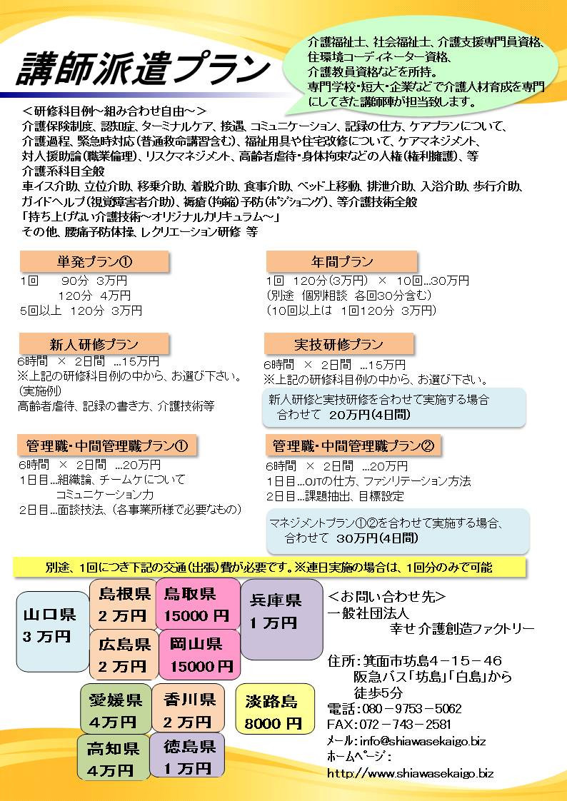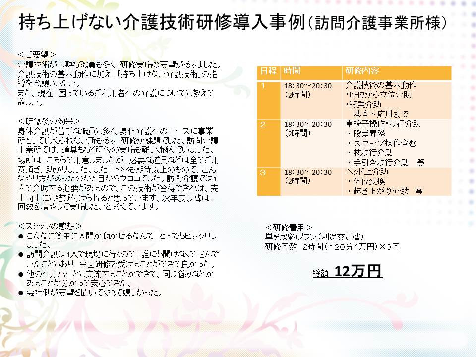 「持ち上げない介護技術」講師派遣を導入した結果、参加者が想定より多く、関心が高いのが分かりました。訪問介護事業所様では、サービス提供責任者が研修を実施する体制は整っているが、介護技術の研修は場所も道具もなく実施が困難ですが、必要な福祉用具(車椅子、クッション、杖等)は全て、こちらで用意することが可能ですので、「持ち上げない介護技術」講師派遣の導入が可能です。