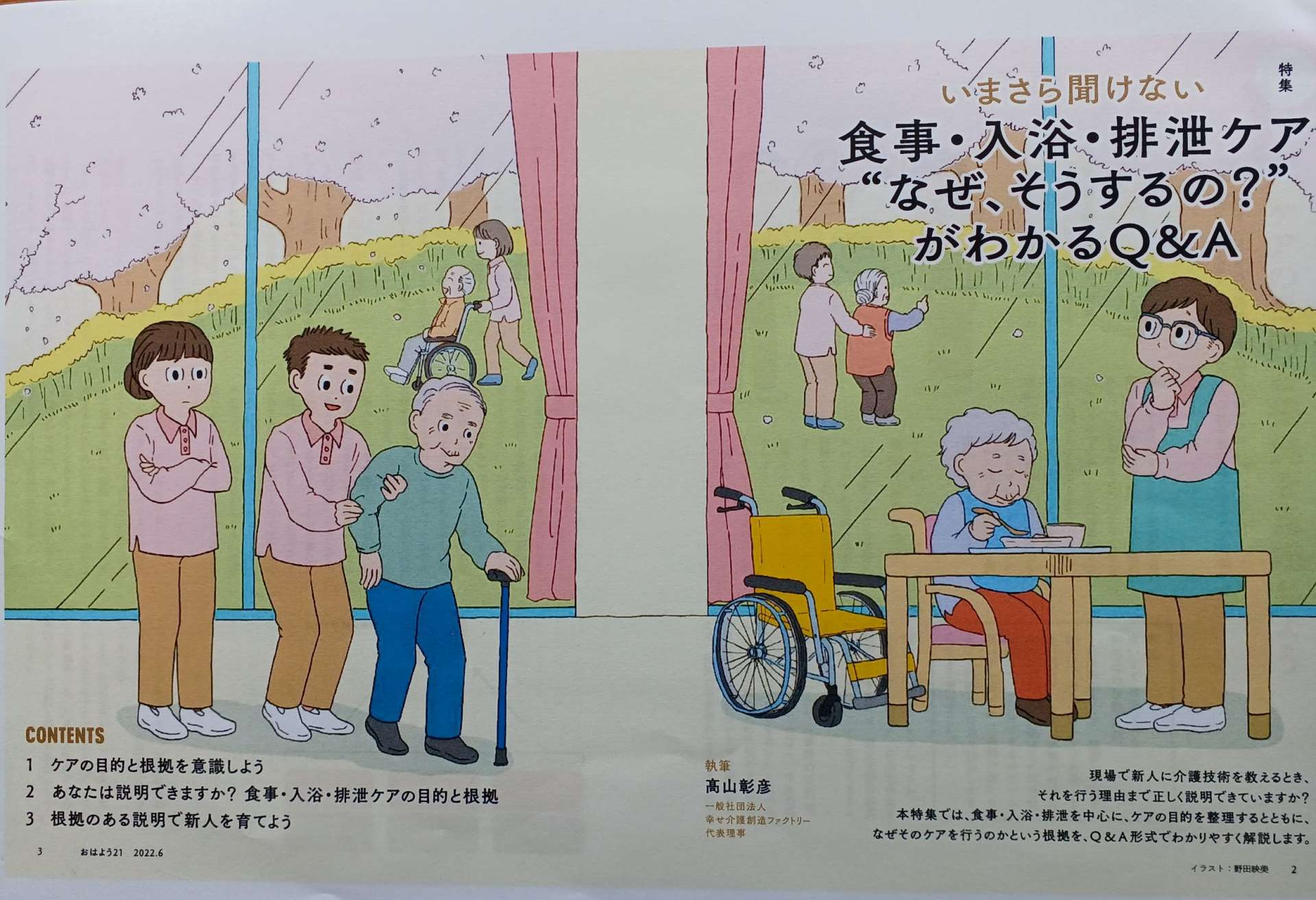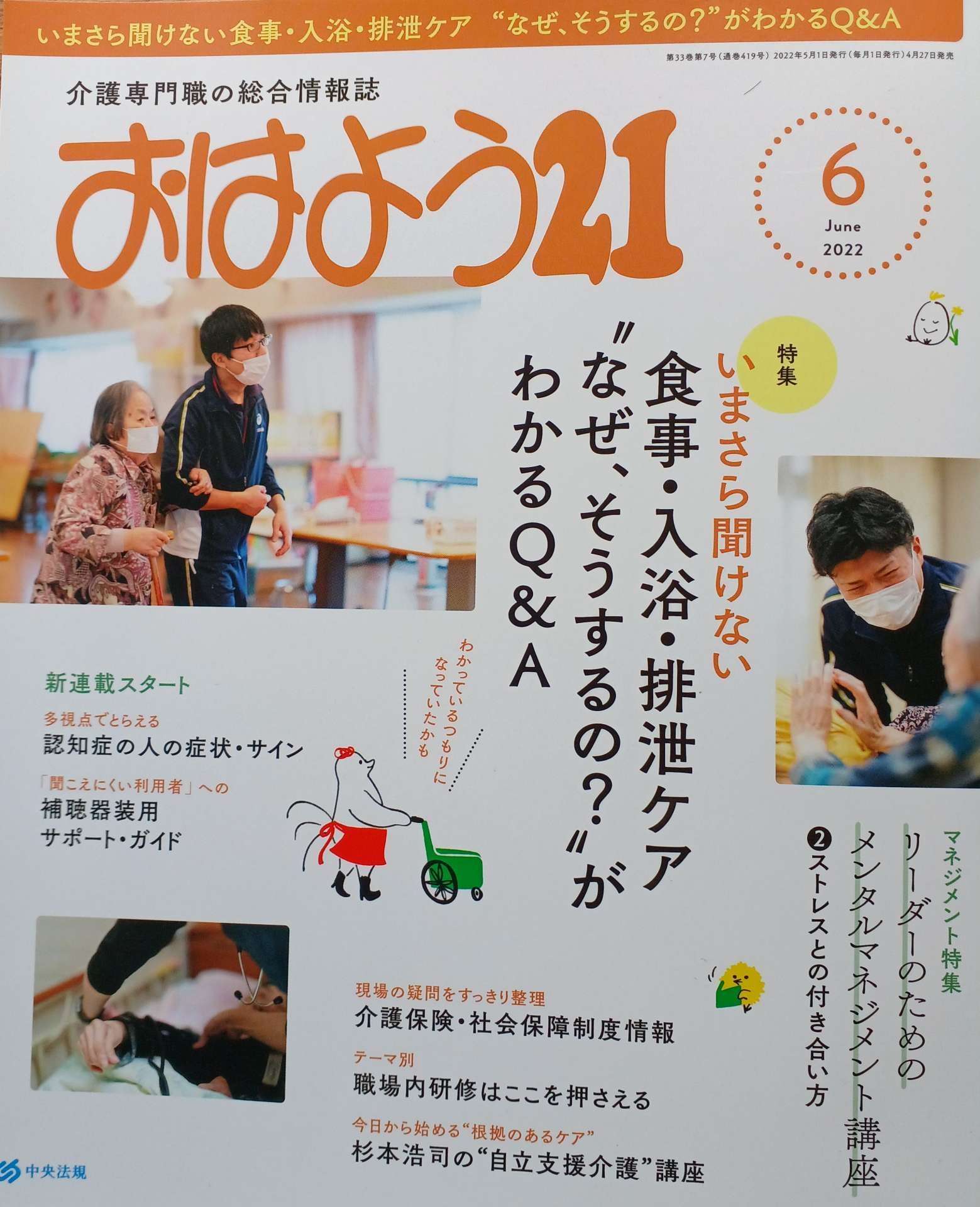 中央法規出版「おはよう21」6月号 執筆記事掲載 2022/05/07 中央法規出版「おはよう21」6月号 執筆記事掲載 中央法規出版「おはよう21」6月号に執筆記事が掲載されました。 「なぜ、そうするの?」が分かる Q&A 特集! いまさら聞けない食事・入浴・排泄ケア 巻頭特集として、 “いまさら聞けない食事・入浴・排泄ケア 「なぜ、そうするの?」が分かる Q&A”全18ページ 新人職員へ指導する際に、「なんとなく…」「私は…」ではなく、しっかり根拠を持って答えらえるように、基本的なことを中心に掲載しています。 また、人材育成に必要な「OJTについて」「新人教育の在り方」についても記載しています。 今、実際に教育担当になっている方はもちろん、これから教育担当となる方などにも、学んで頂ける内容になっています。ぜひ、ご覧下さい。 同じ内容を講師派遣でも利用可能 講師派遣料 90分…33000円(税込み) 120分…44000円(税込み) ※年間5回以上の利用で1回120分まで33000円(税込み) 別途現地までの交通費(公共交通利用)が必要です。 講師派遣の詳細はこちら お問い合わせはこちら 書籍・執筆のご案内
