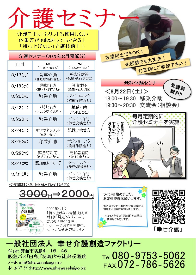 介護(技術)セミナー日程<大阪>2020年8月開催分